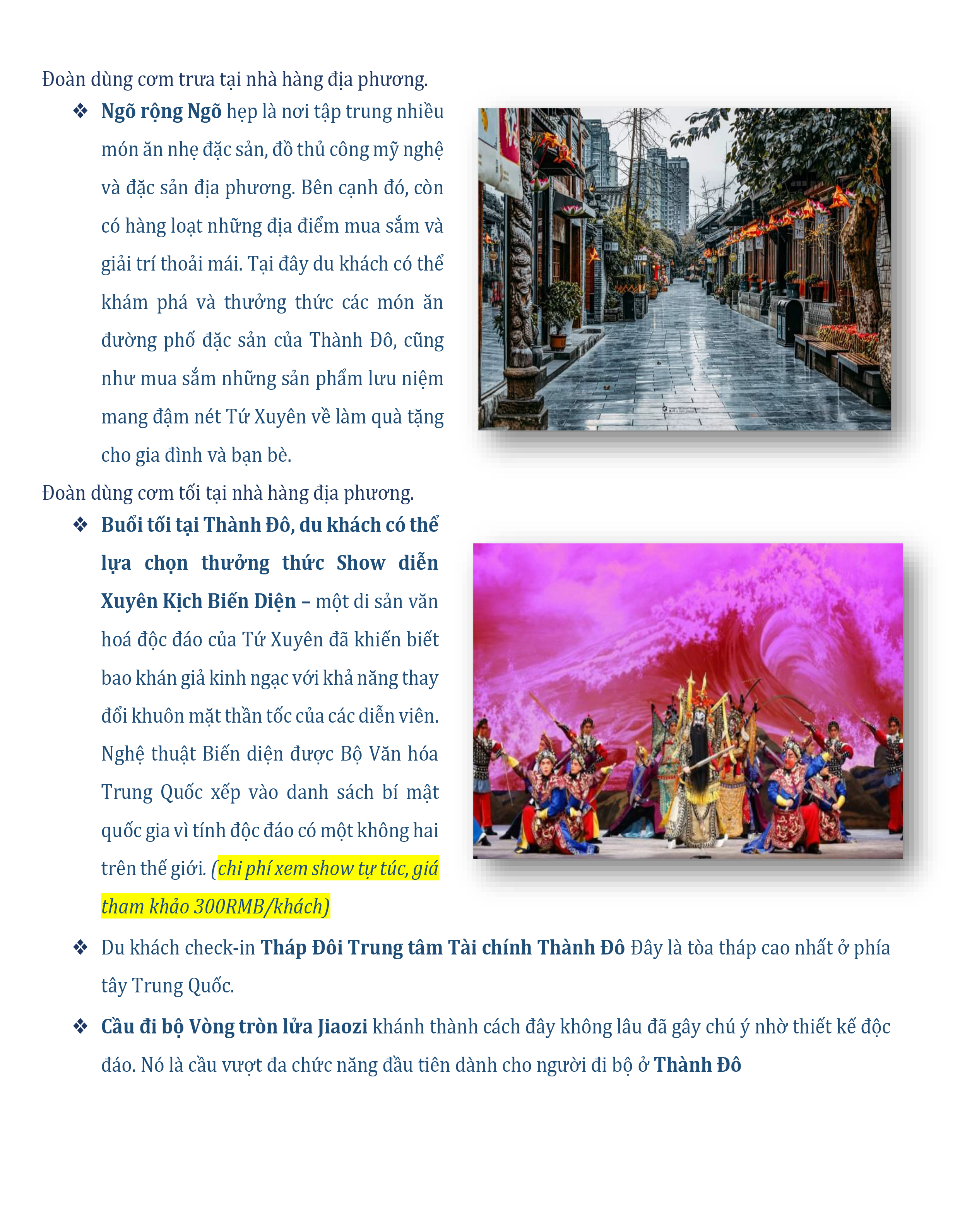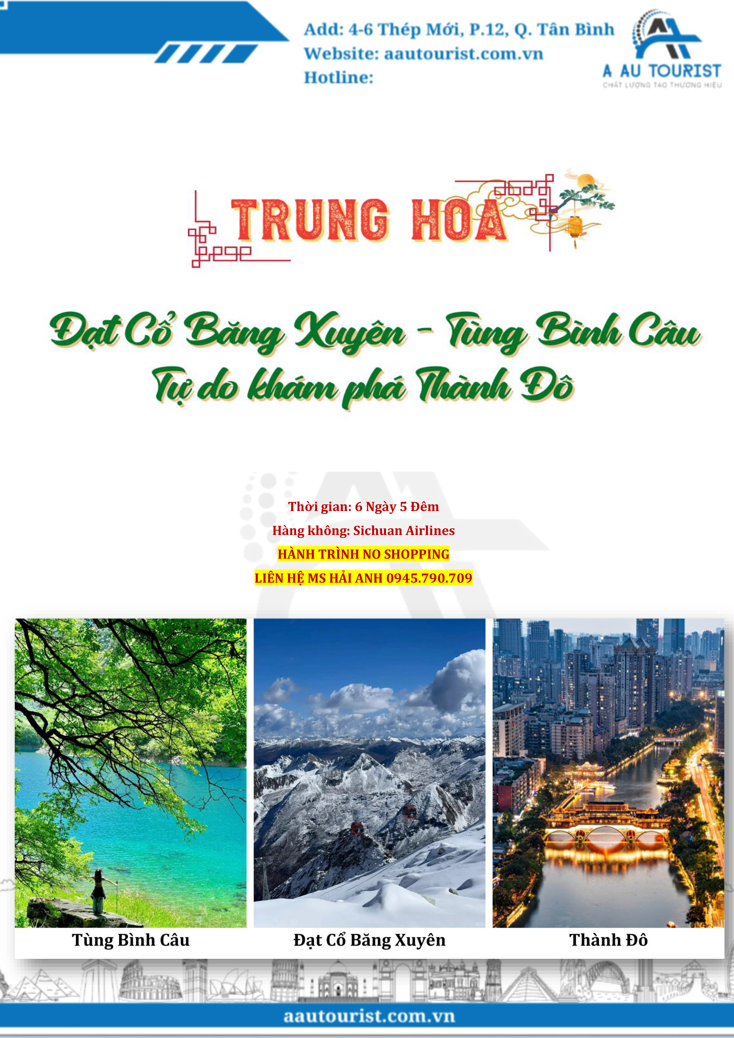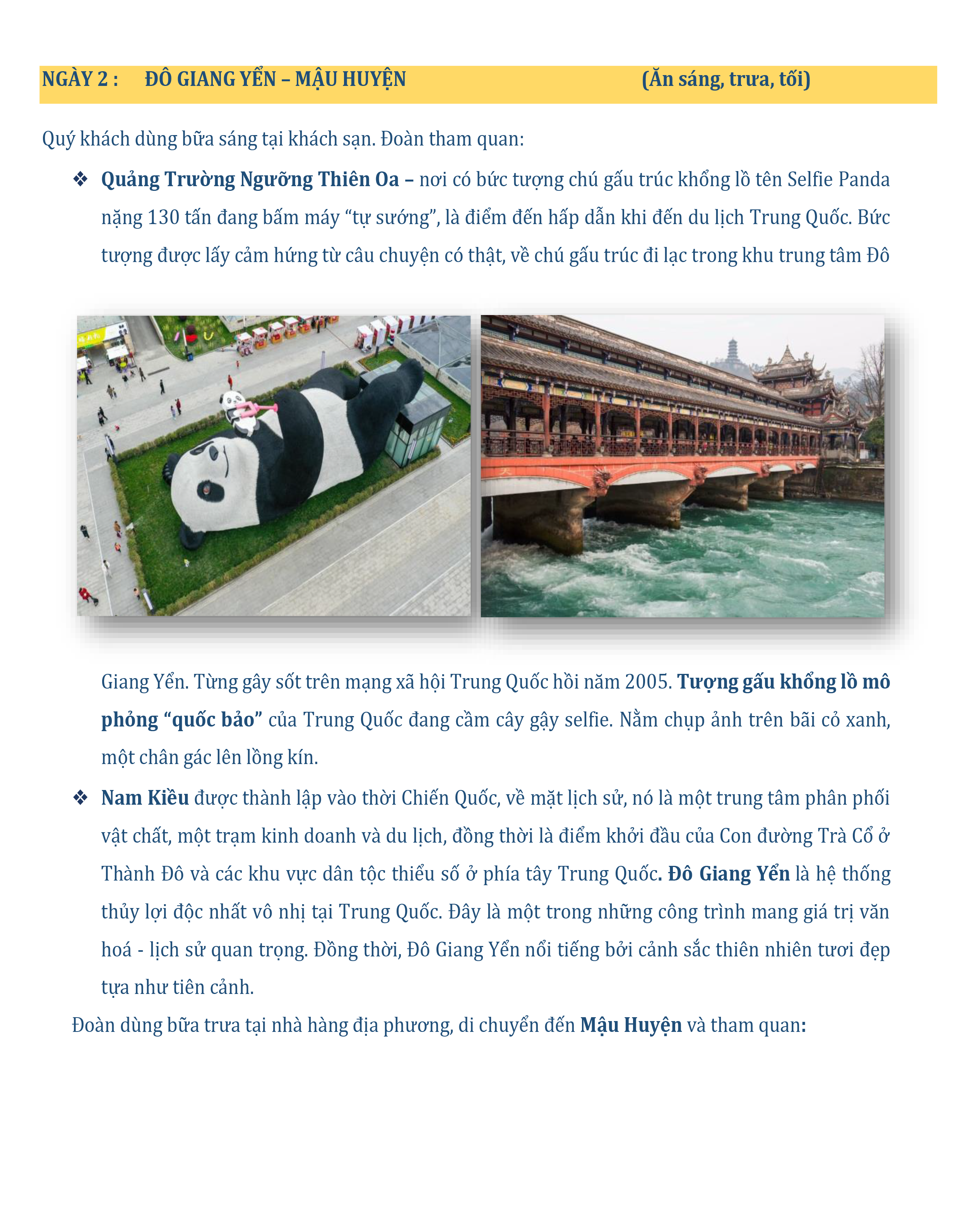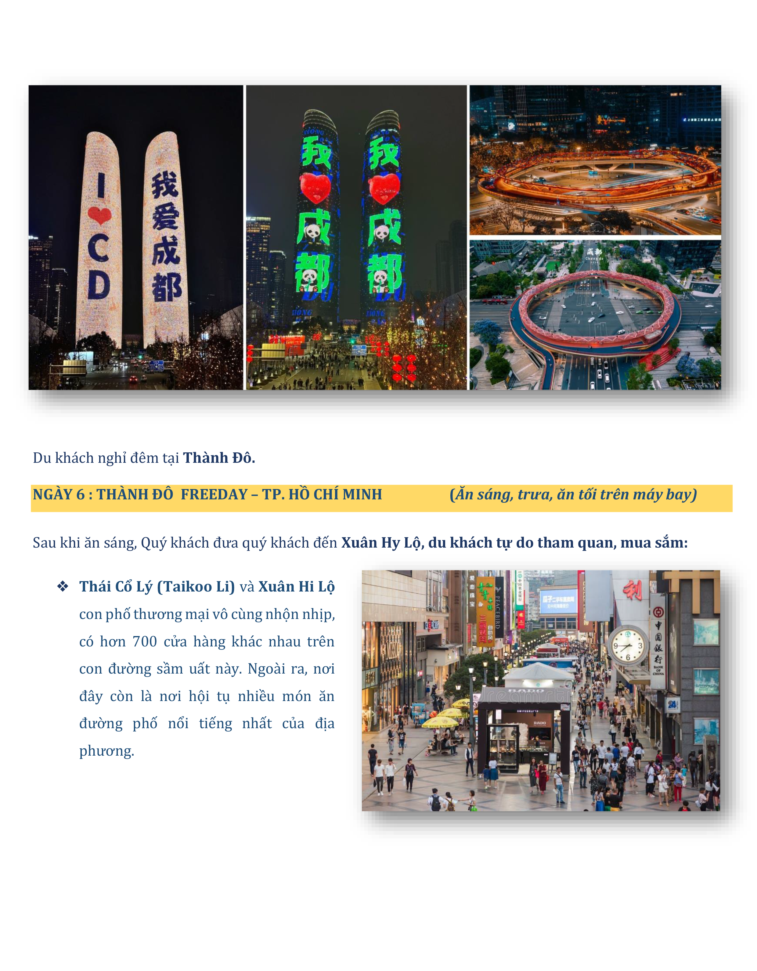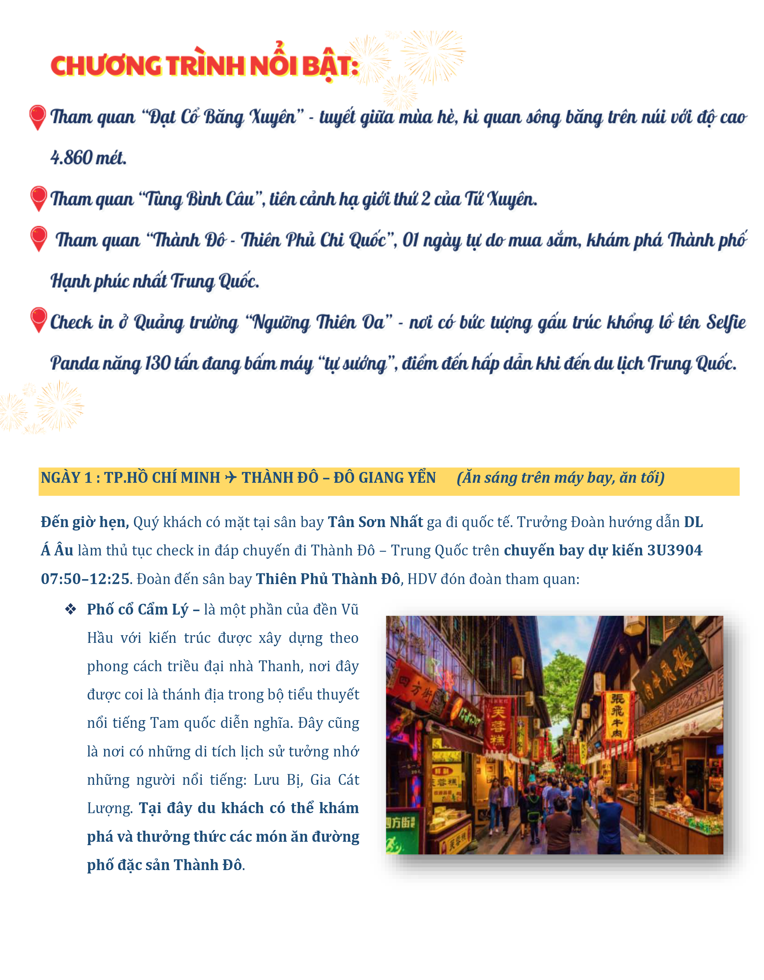 CHƯƠNG TRÌNH NỔI BẬT: Tham quan “Đạt Cổ Băng Xuyên” - tuyết giữa mùa hè, kì quan sông băng trên núi với độ cao 4.860 mét. Tham quan “Tùng Bình Câu”, tiên cảnh hạ giới thứ 2 của Tứ Xuyên. Tham quan “Thành Đô - Thiên Phủ Chi Quốc”, 01 ngày tự do mua sắm, khám phá Thành phố Hạnh phúc nhất Trung Quốc. Check in ở Quảng trường “Ngưỡng Thiên Oa” - nơi có bức tượng gấu trúc khổng lồ tên Selfie Panda năng 130 tấn đang bấm máy “tự sướng”, điểm đến hấp dẫn khi đến du lịch Trung Quốc.
