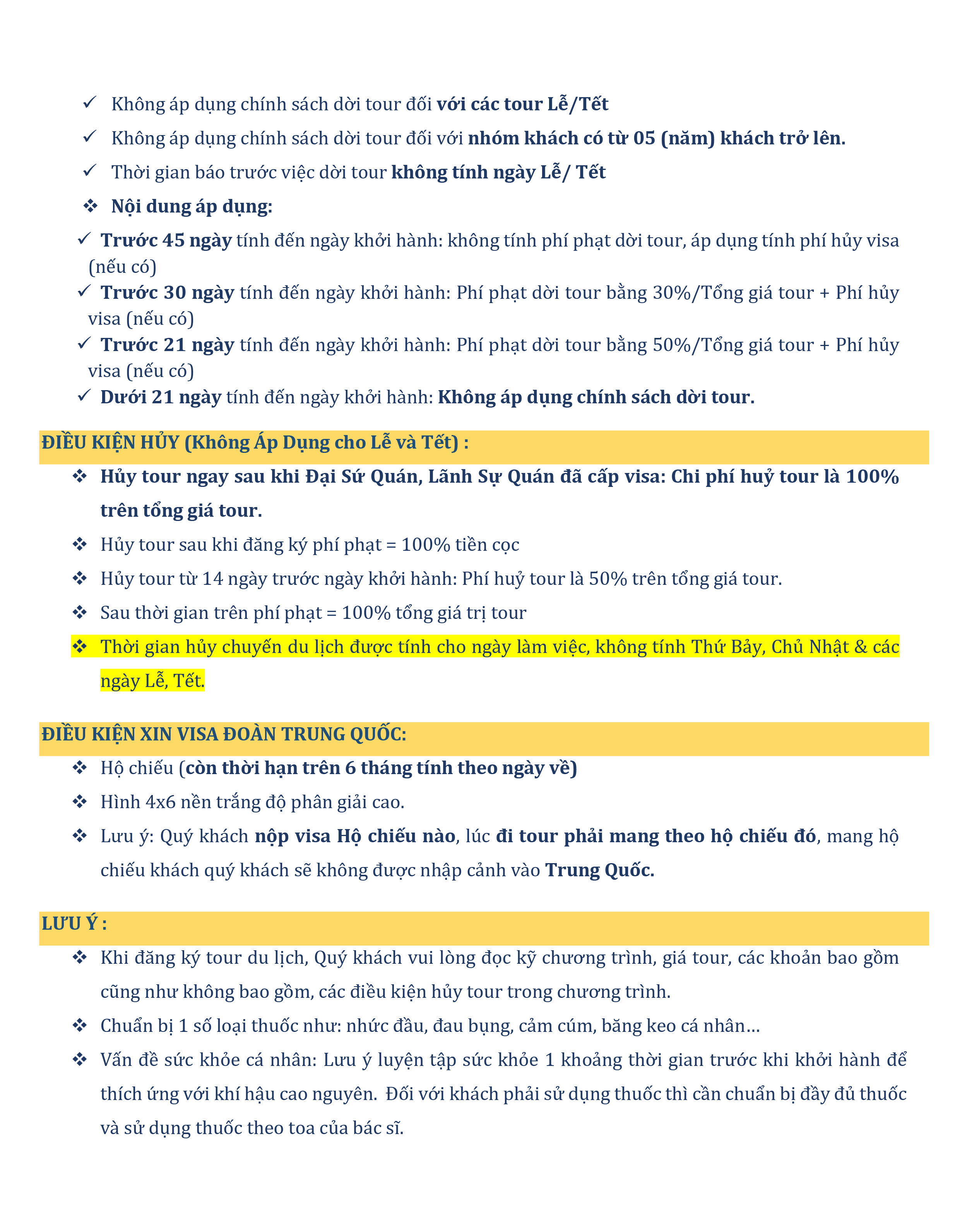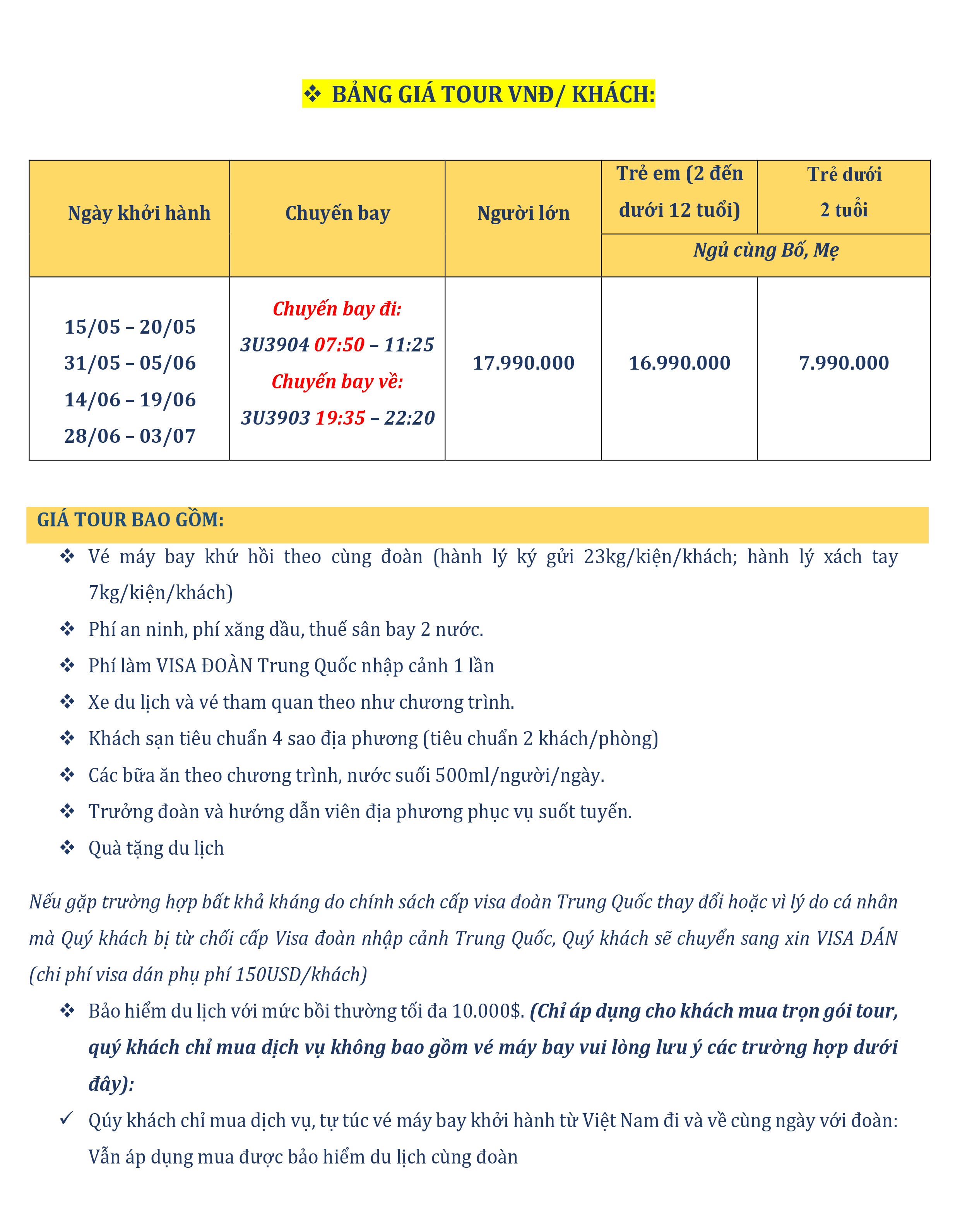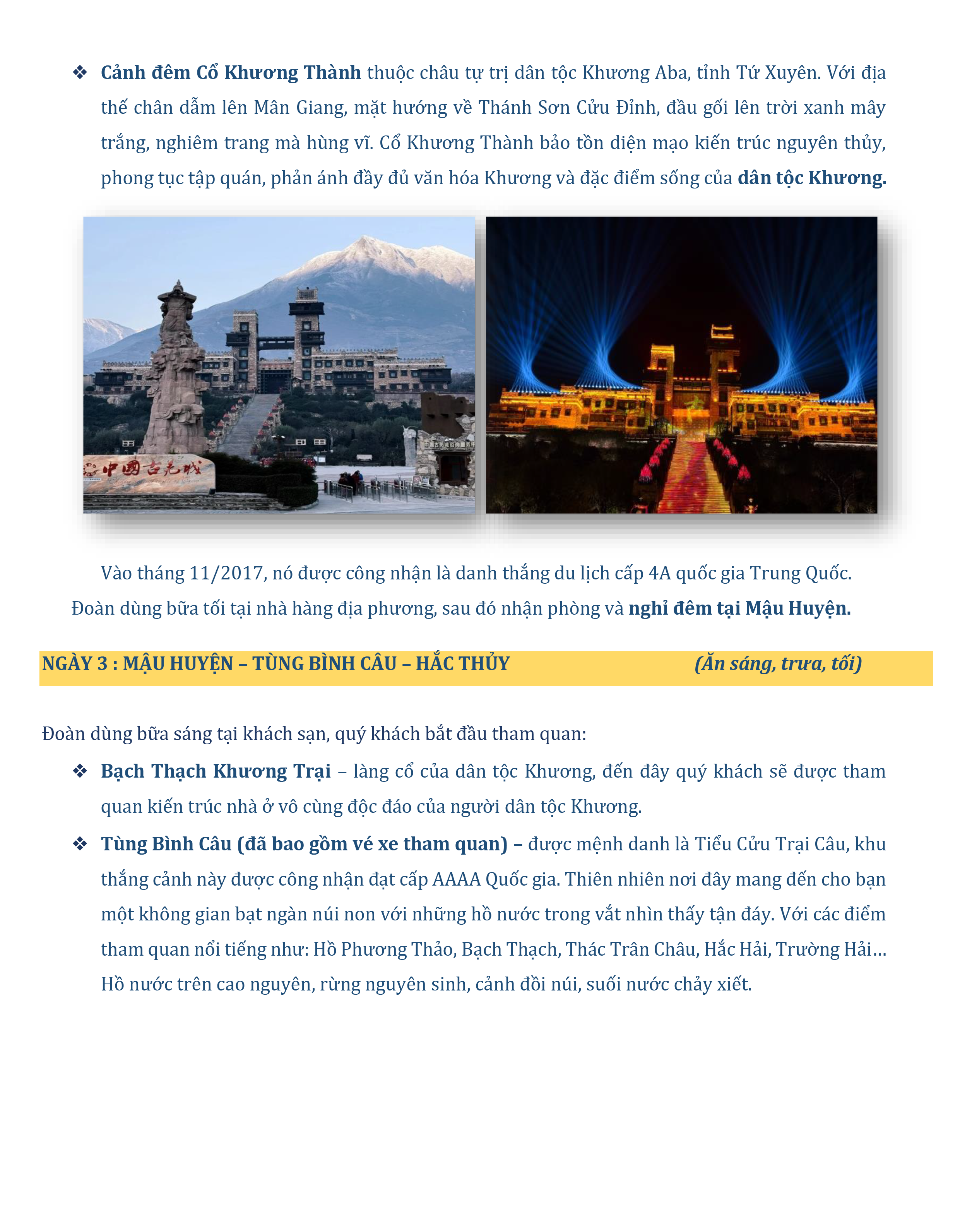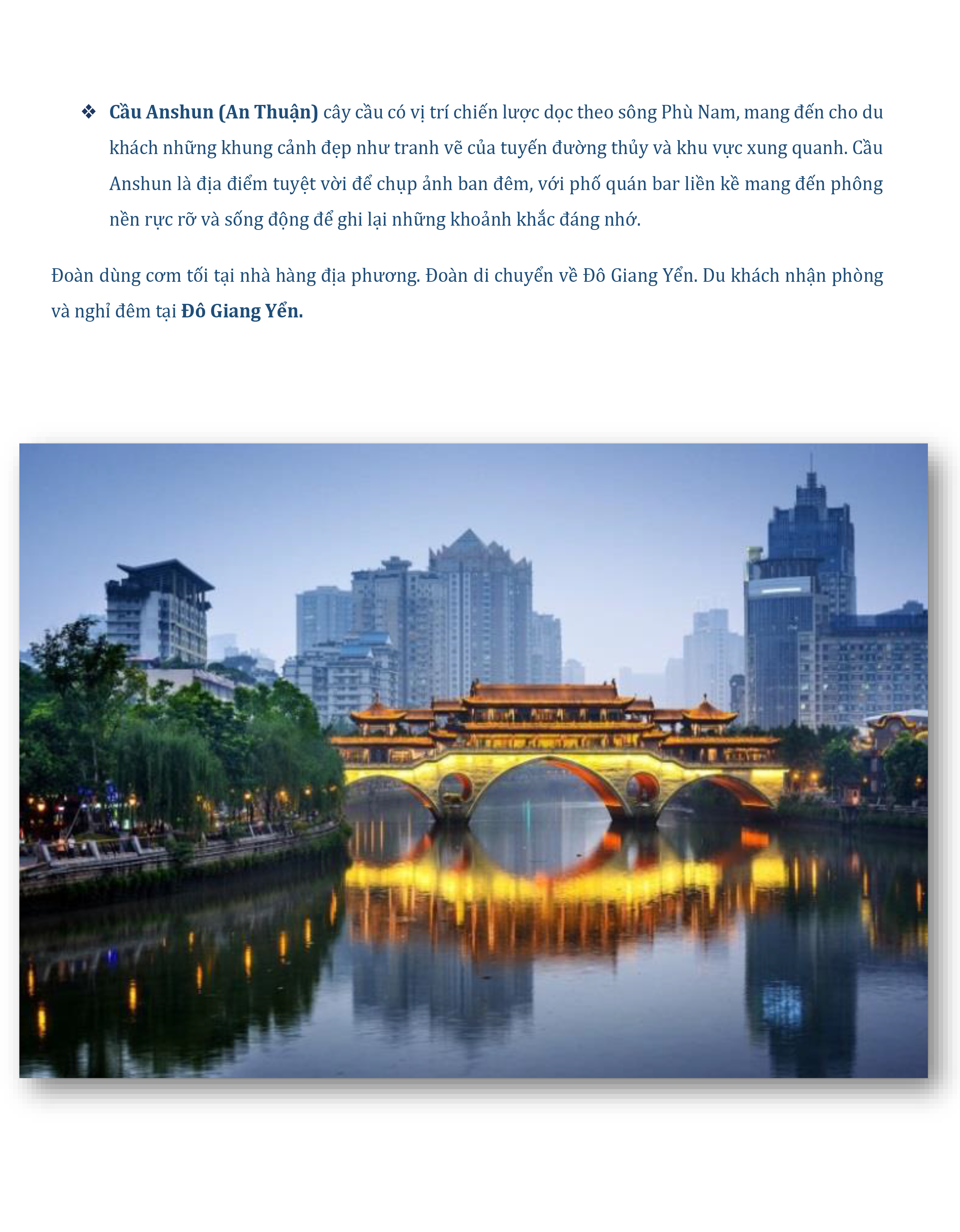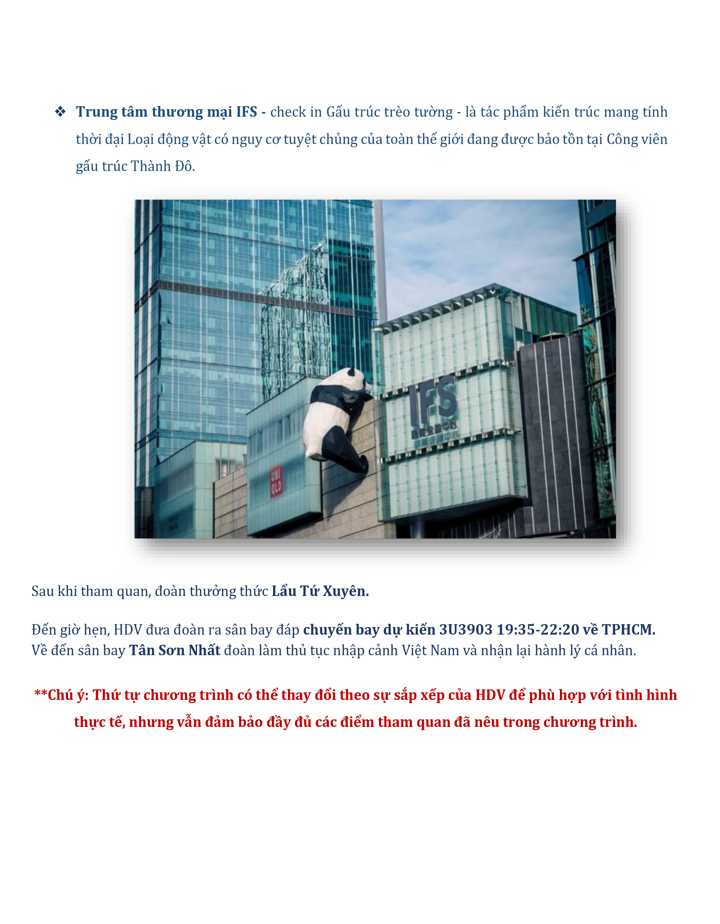CHƯƠNG TRÌNH NỔI BẬT: Tham quan “Đạt Cổ Băng Xuyên” - tuyết giữa mùa hè, kì quan sông băng trên núi với độ cao 4.860 mét. Tham quan “Tùng Bình Câu”, tiên cảnh hạ giới thứ 2 của Tứ Xuyên. Tham quan “Thành Đô - Thiên Phủ Chi Quốc”, 01 ngày tự do mua sắm, khám phá Thành phố Hạnh phúc nhất Trung Quốc. Check in ở Quảng trường “Ngưỡng Thiên Oa” - nơi có bức tượng gấu trúc khổng lồ tên Selfie Panda năng 130 tấn đang bấm máy “tự sướng”, điểm đến hấp dẫn khi đến du lịch Trung Quốc.